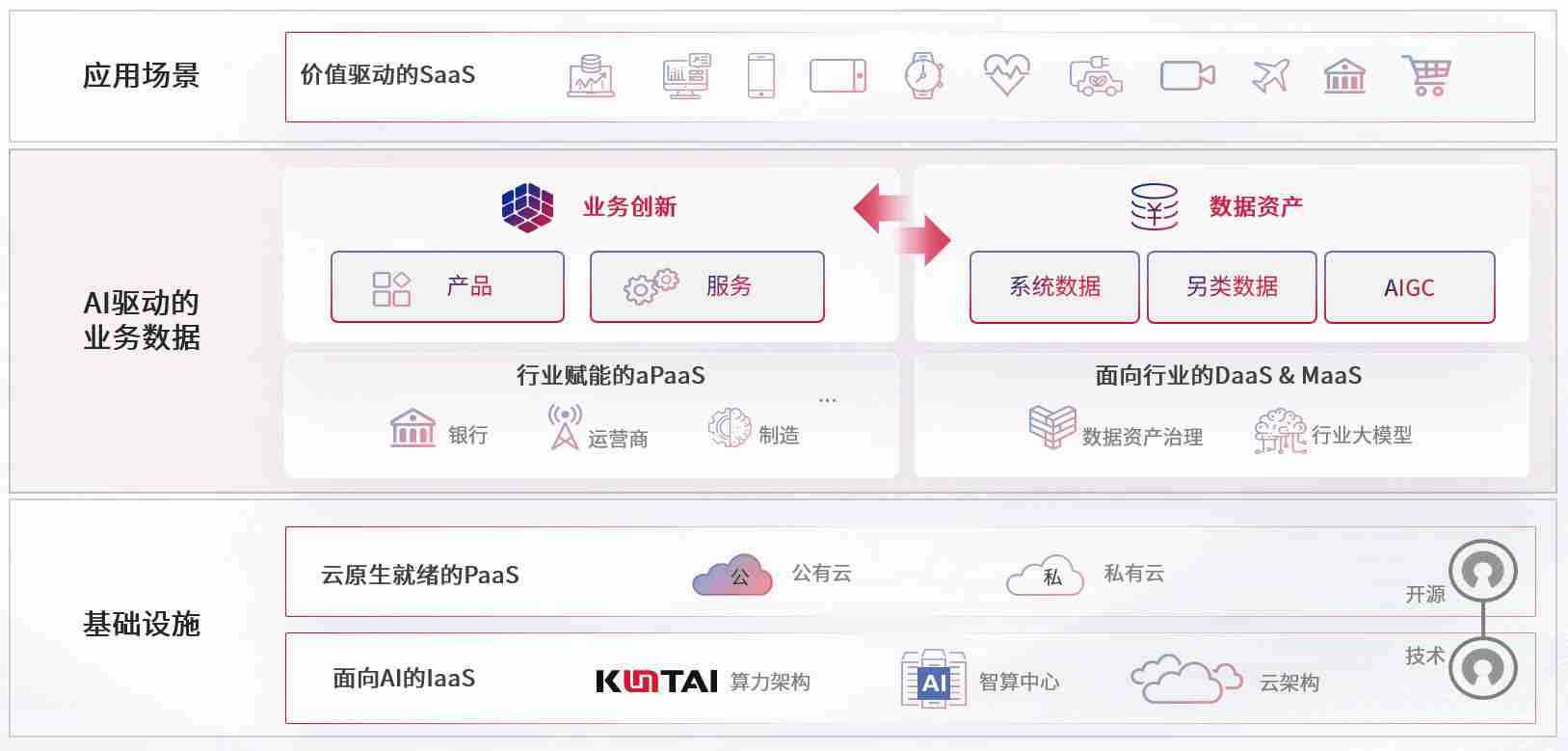 数字时代,,,围绕企业数字化转型的关键要素,,PA旗舰厅数码开创性的提出数云融合战略和技术体系框架,,,着力在云原生、、数字原生、、AI原生和信创产业上架构产品和服务能力,,为处在不同数字化转型阶段的快消零售、、、、汽车、、金融、、、医疗、、、政企、、教育、、、运营商等行业客户提供泛在的敏捷IT能力和融合的数据驱动能力,,构建跨界融合创新的数字业务场景和新业务模式,,,助力企业级客户建立面向未来的核心能力和竞争优势,,全面推动社会的数字化、、、、智能化转型升级。。。